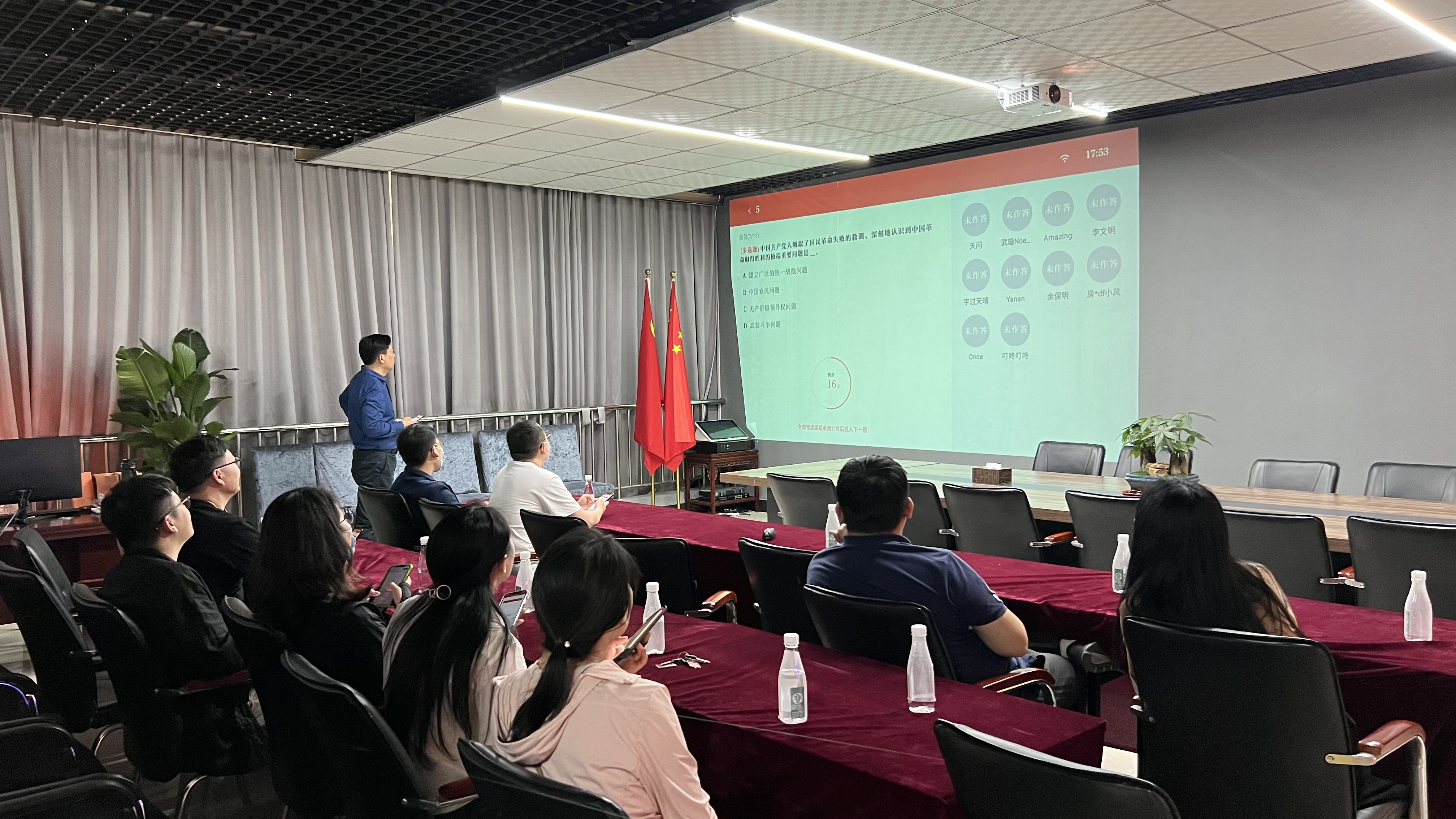 随后,全体人员通过登录“学习强国”一体机,开展集中学习,并进行了“学习强国”个人答题挑战赛。