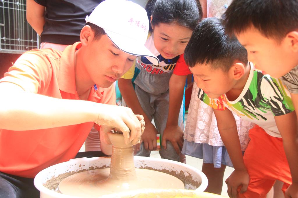 布置好场地后,志愿者为孩子们详细介绍了拉坯机的用法以及注意事项,他们双手蘸上水抱起泥团,利用轮盘转动的惯性,压窝、拨高、挤压、窝泥,泥团随之变大变小,左手辅助,右手向外慢慢扩张,一会儿功夫一个精美的陶罐就制作完成了。看到这里,孩子们热情高涨,在志愿者的带领下逐个进行创作体验,平凡的陶泥在大小手的合力作用下,慢慢成型。通过指尖对泥土的触摸与感知,制作属于自己的陶器,使孩子们感受到拉坯所带来的无限乐趣。