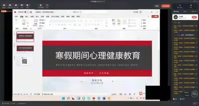 接下来,王培静老师通过针对假期同学们心理状况开展了寒假期间心理健康教育。同时,王培静老师希望同学们在开学前调整作息时间,走出信息沉溺,多读书,少游戏,帮助父母做一些力所能及的事情,合理规划学习生活。会议最后,王培静老师开展2022年征兵动员宣讲会,详细解读了最新老员工参军入伍的优惠政策,希望同学们积极响应政策,增强老员工国防意识、爱国意识、点燃参军热情。