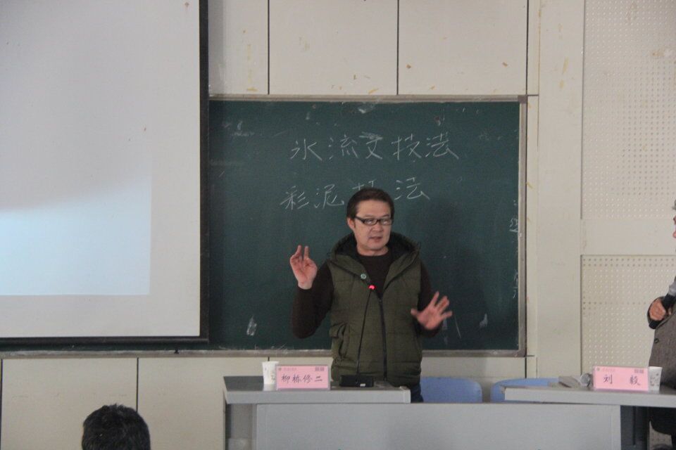 柳桥修二老师向同学们介绍了冰流文技法和彩泥技法。冰流文技法主要是以拉坯为基础,由塑烧转变为哑光烧,挂上粗釉后正常,并在上面用化妆土做出色彩的“冰纹”图样,主要用烧制于制作茶具、餐具等。彩泥技法则是应用在平面上,在瓷器上雕刻几何图形,从不同角度来展现作品的美。柳桥修二老师强调陶艺制作要有硬功夫、新思想和好创意,他建议同学们要学会利用员工时代的丰富资源专心学习制陶工艺,打好基础,为今后的陶艺之路最好铺垫。